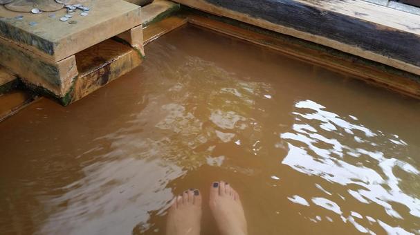 源泉かけ流しの露天風呂で、黄金の湯を楽しめます。